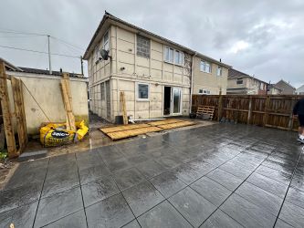 REAR: Enclosed rear garden with newly laid patio and area of lawn.