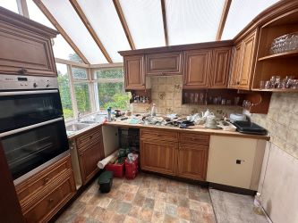KITCHEN: 9’01 x 6’09– Lean-to, fitted with a range of base and wall units, incorporating one and a half bowl stainless-steel sink and drainer, integrated grill and oven, windows to rear and door leading to rear entrance hall.