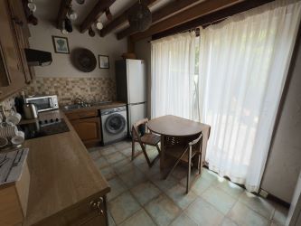 KITCHEN/BREAKFAST ROOM: 3.99 x 2.44 - Fitted with a range of matching wall and base units with work surface over, four ring ceramic hob with extractor fan over and electric oven under, stainless steel 1 and 1/2 bowl sink with drainer and mixer tap, space for fridge/freezer, plumbing for washing machine, tile effect vinyl flooring, uPVC double glazed sliding patio doors, radiator, oil boiler, part wooden cladding to wall, ceiling beams, door to pantry cupboard.