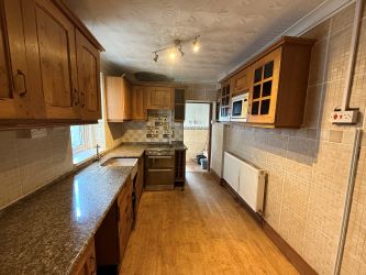 KITCHEN: 2.38 x 3.37m- Wall and floor units, sink, cooker, window to side, door to small hallway.